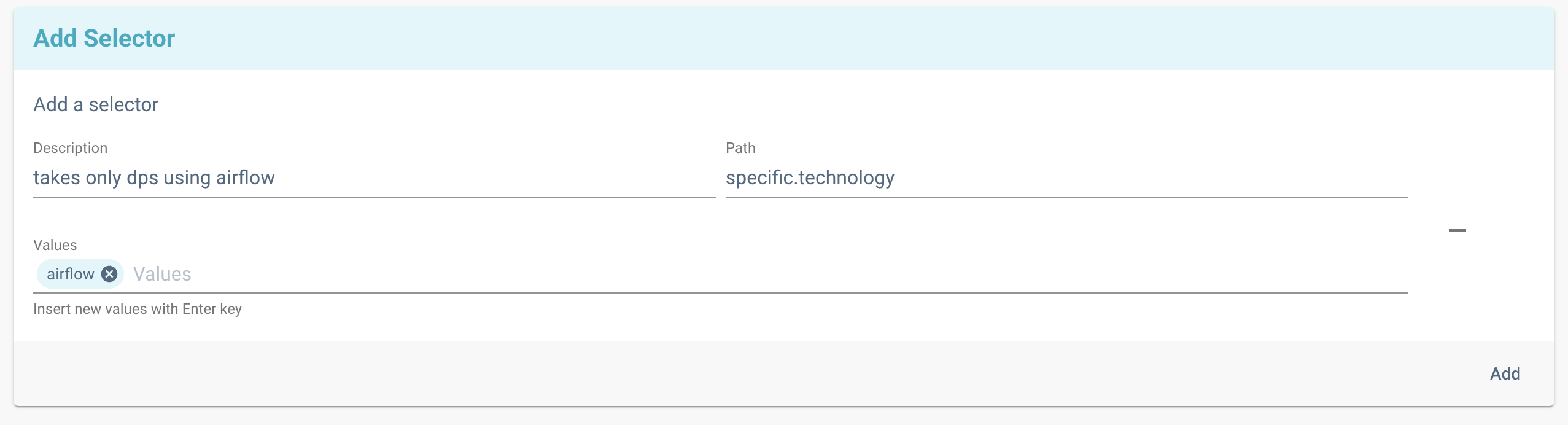 A selector checks that a given field of the resource's descriptor is equal to one of the allowed values.